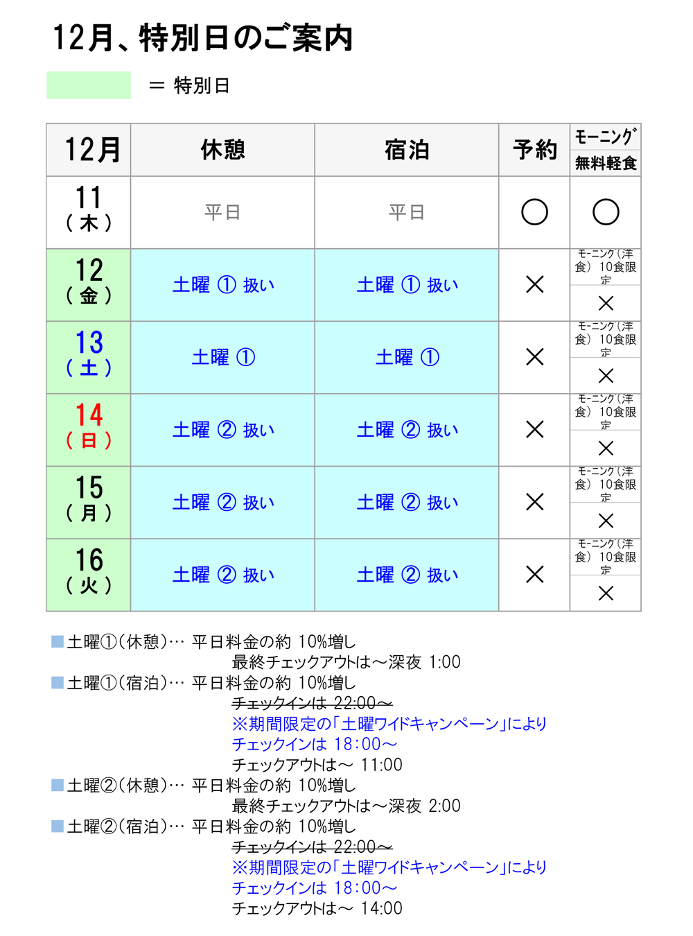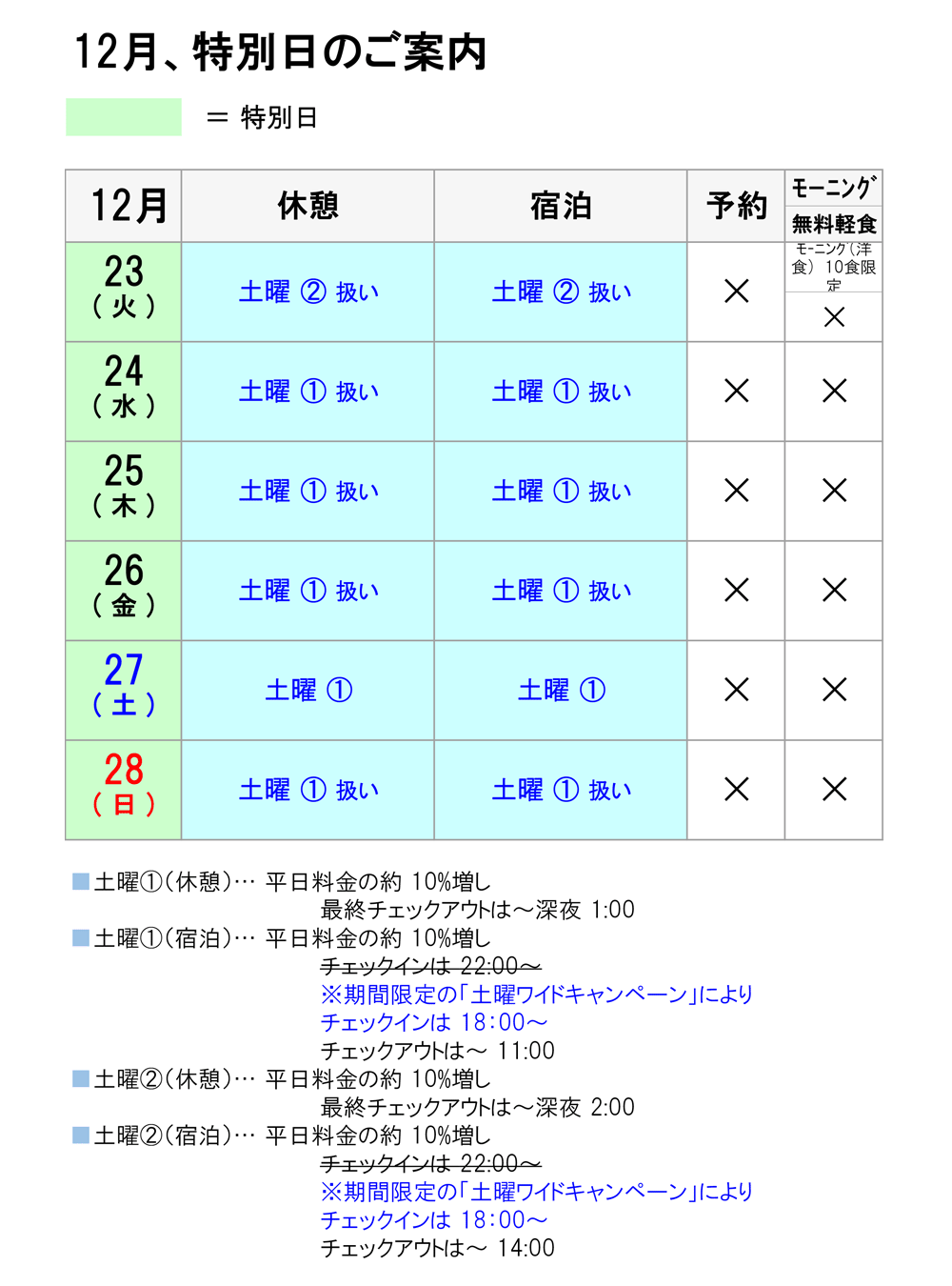 12月 特別日の料金、時間、予約につきましては、以下のとおりとなっております。