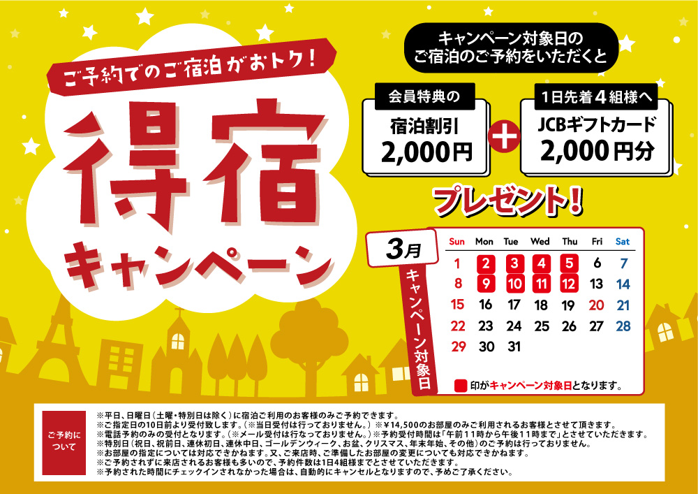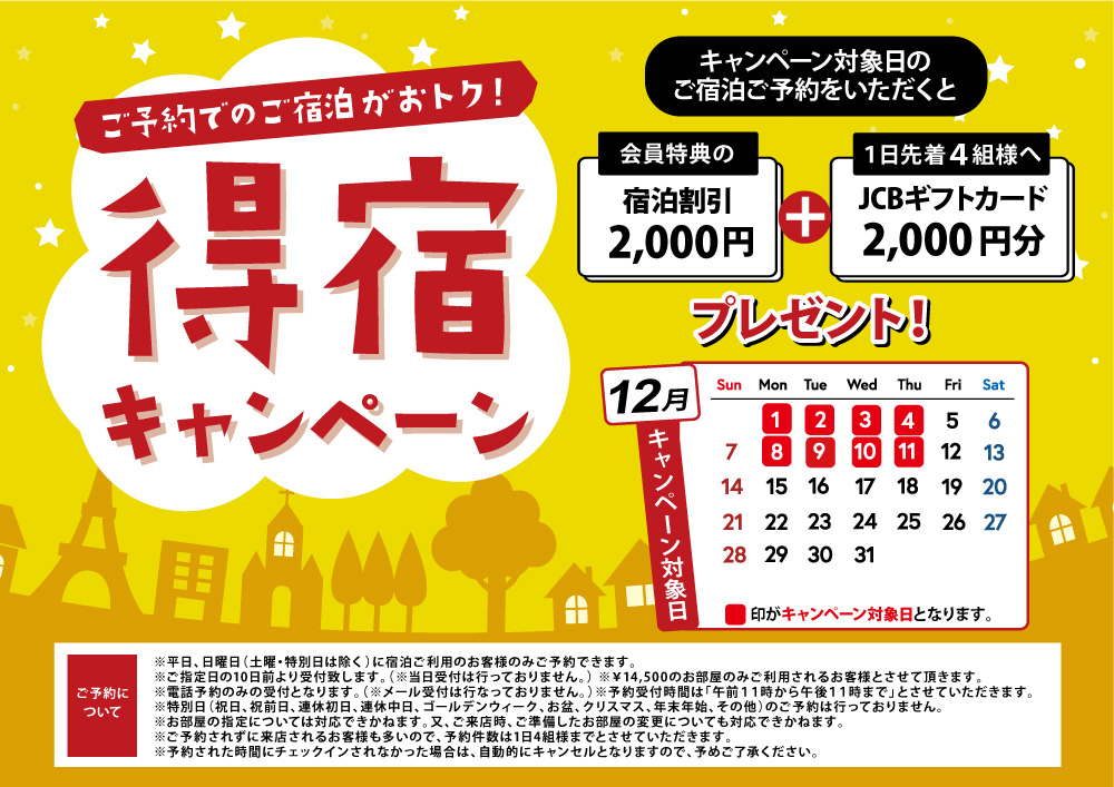会員様特典の宿泊割引2,000円+1日先着4組様へJCBギフトカード2,000円分プレゼント!