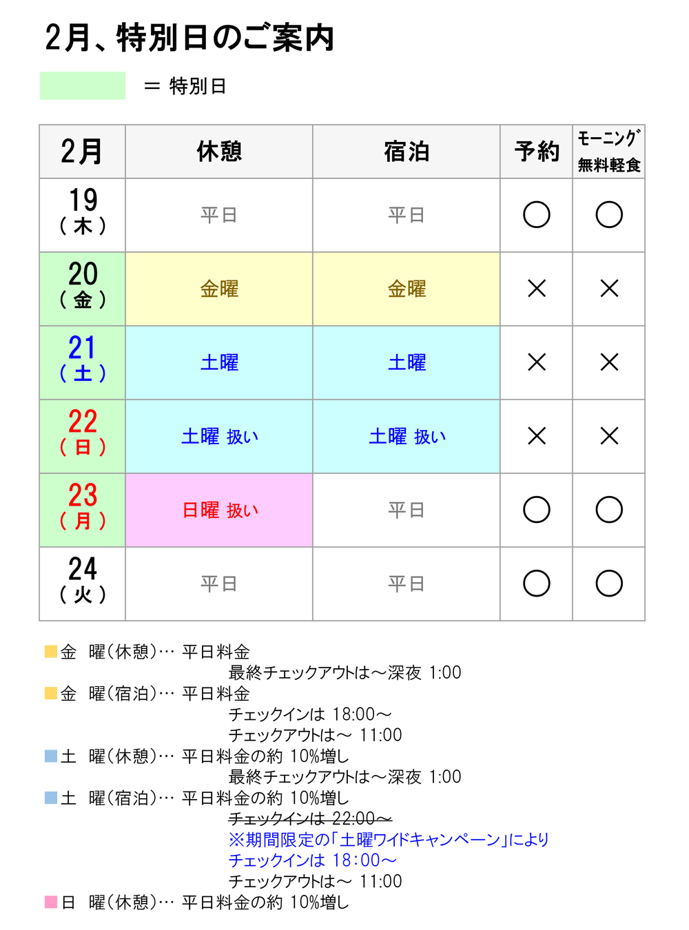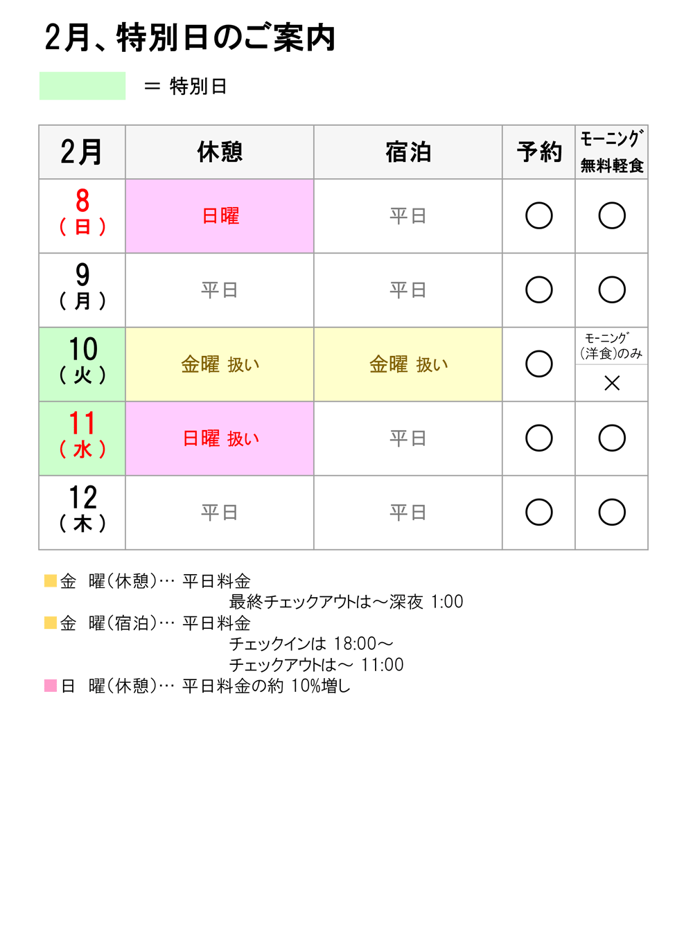 2月 特別日の料金、時間、予約につきましては、以下のとおりとなっております。