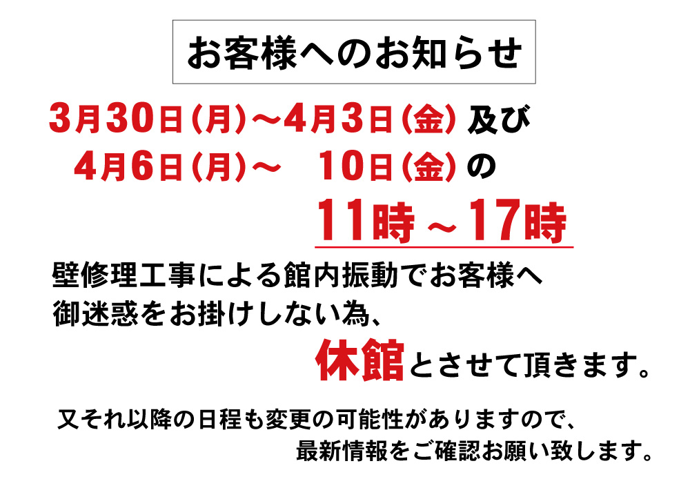 壁修理工事による館内振動でお客様へ御迷惑をお掛けしない為、休館とさせて頂きます。